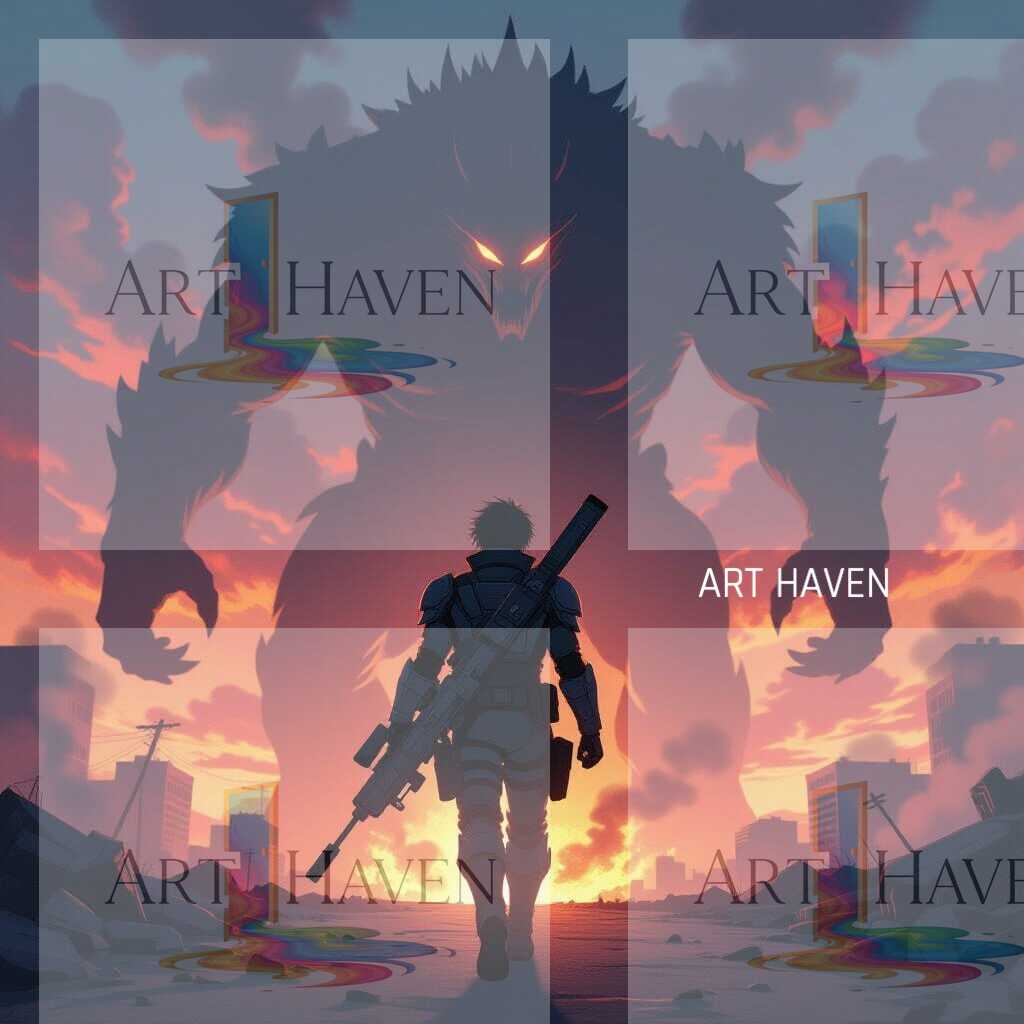 High-Resolution Digital Artwork: Every detail of the desert, hero, and monster rendered in sharp, cinematic clarity.